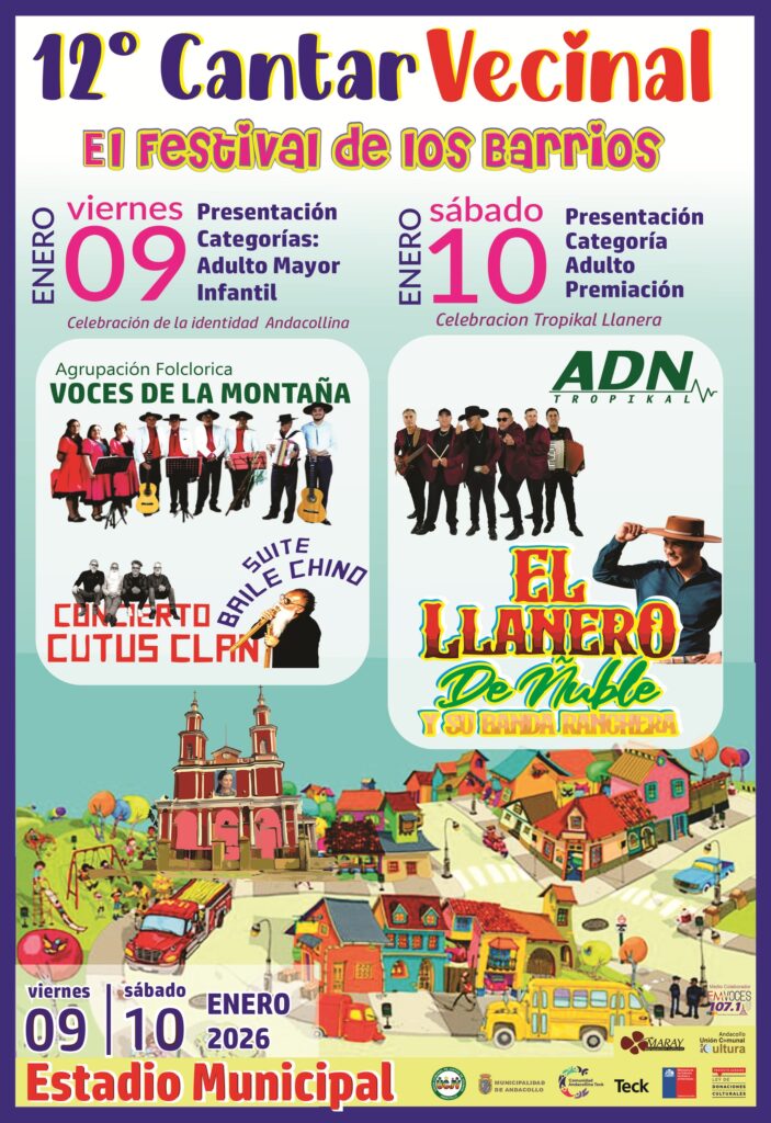 El XII Cantar vecinal “El Festival de los Barrios”, se realizará en el Estadio Municipal de Andacollo, los días viernes 09 y sábado 10 de enero de 2026, desde las 20:30 horas, con entrada libre y gratuita; donde participan cantantes amateurs representando a sus juntas de vecinos; con premios que van desde los $400.000 para el primer lugar, $300.000 para el segundo lugar, $200.000 para el tercer lugar y $100.000 para el cuarto lugar; con la particularidad que cada Junta de Vecinos recibe el mismo monto en premio.
