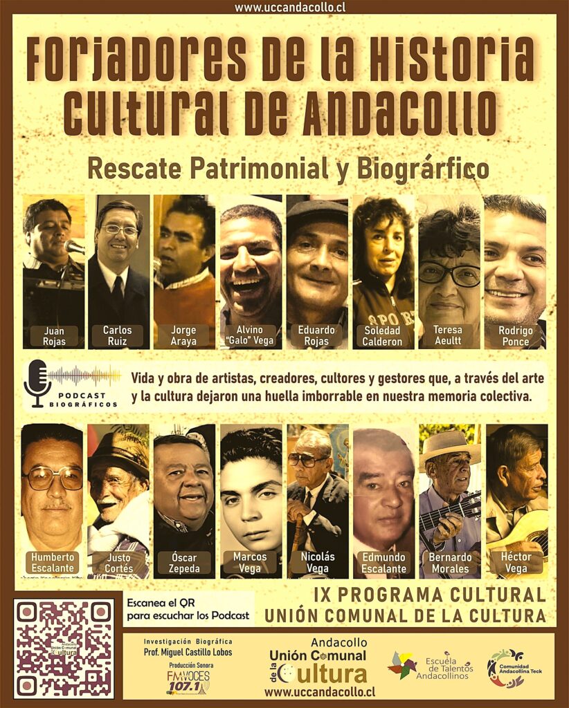 Esta iniciativa de reconstrucción y resguardo patrimonial, contó con el material de investigación realizado por el profesor Miguel Ángel Castillo Lobos y producidas por el equipo de FM Voces de la Escuela de Talentos Andacollinos, en total son 18 historias biográficas, y puede ser disfrutada en la página https://uccandacollo.cl/forjadores-andacollinos también está disponible para los medios que deseen difundir, en el link https://soundcloud.com/radio-fmvoces/sets/forjadores-de-la-identidad) .